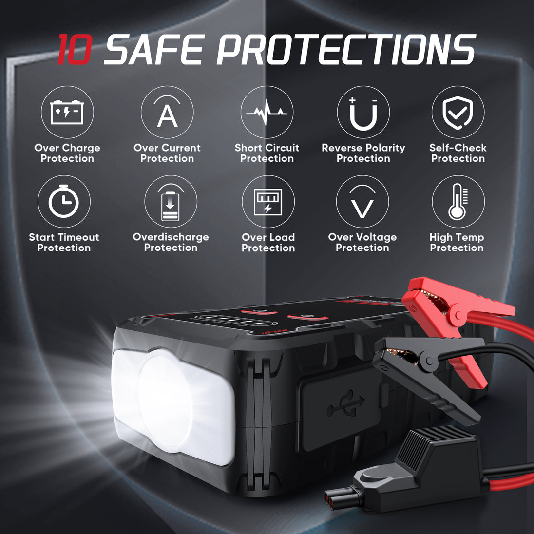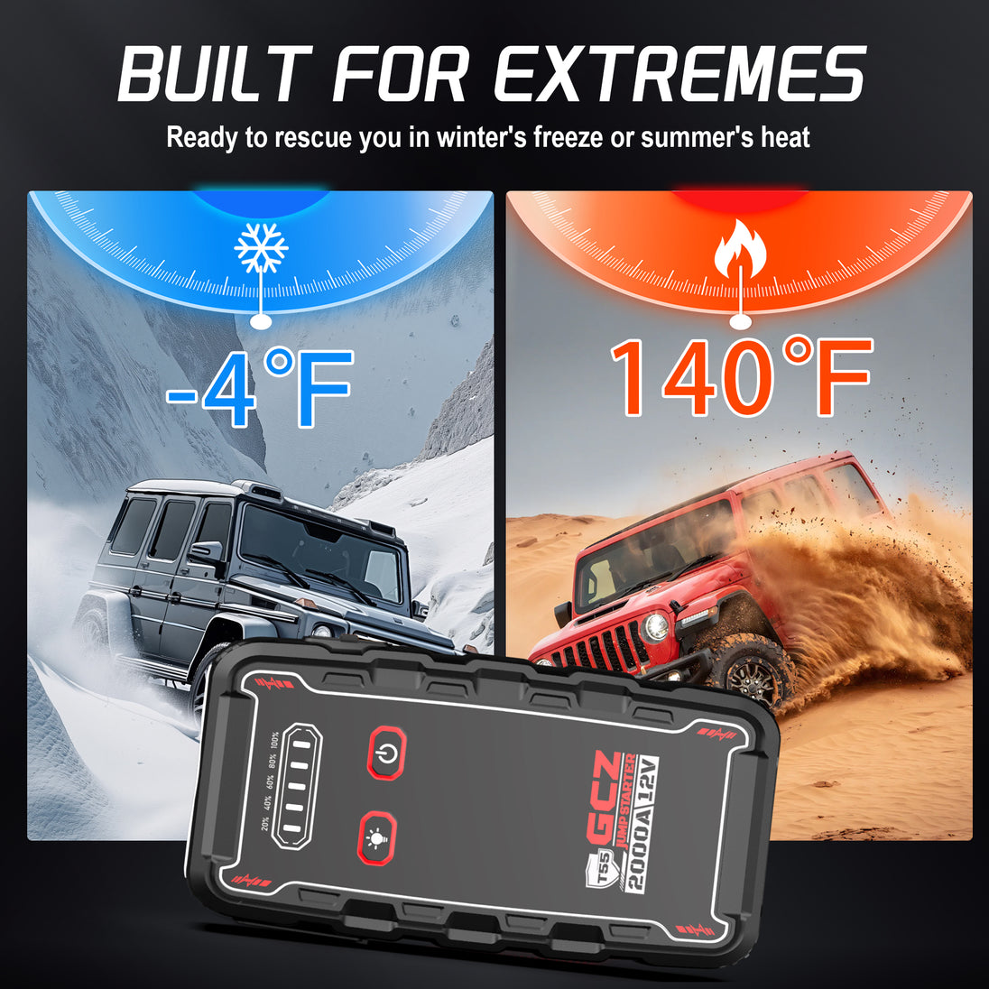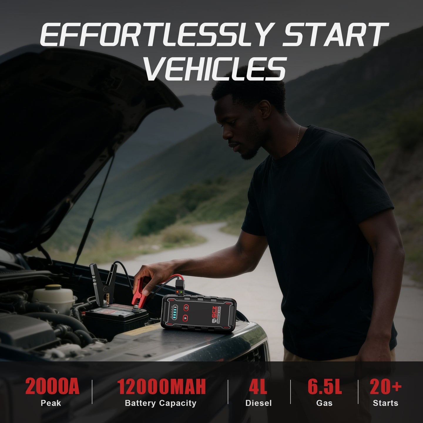 With up to 2000A peak current, this jump starter can quickly restart 12V vehicles including cars, SUVs, trucks, and more — even in extreme conditions.